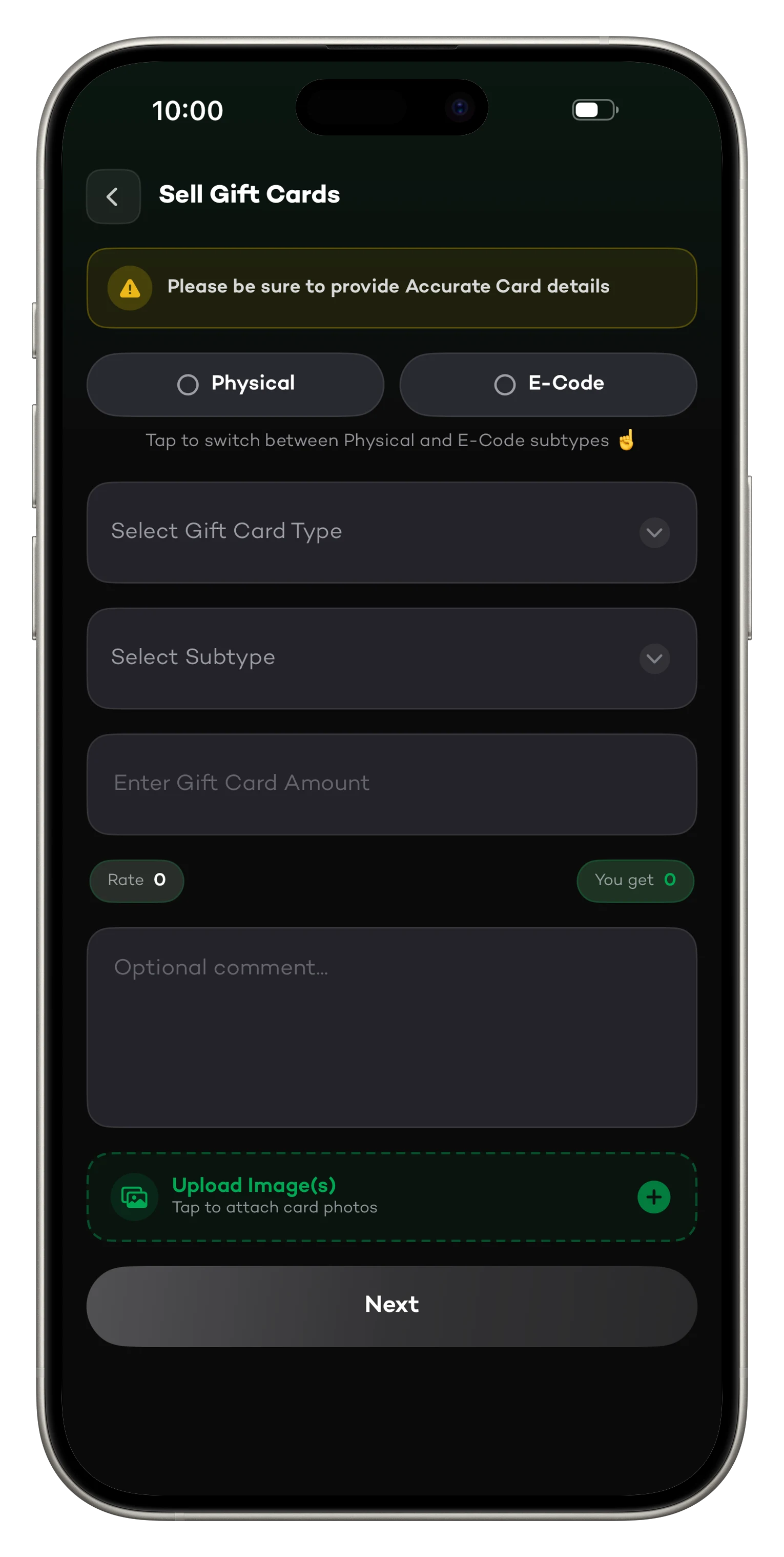 Choose your card type, enter the amount, upload your card images or e-code, and submit. We'll keep you updated at every stage.